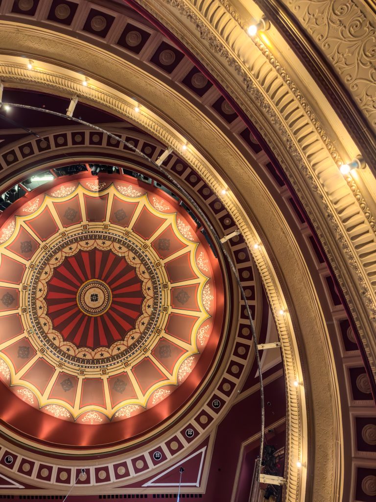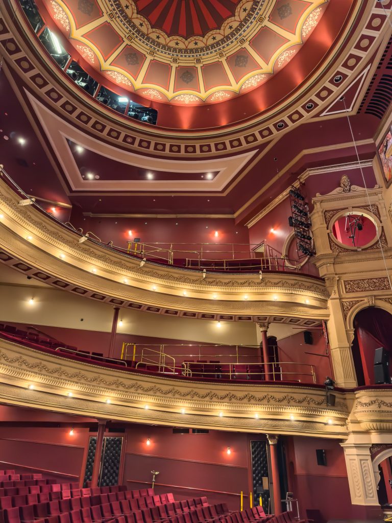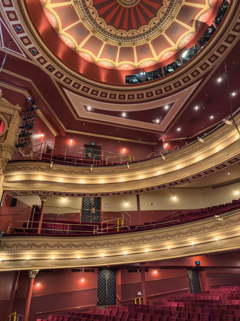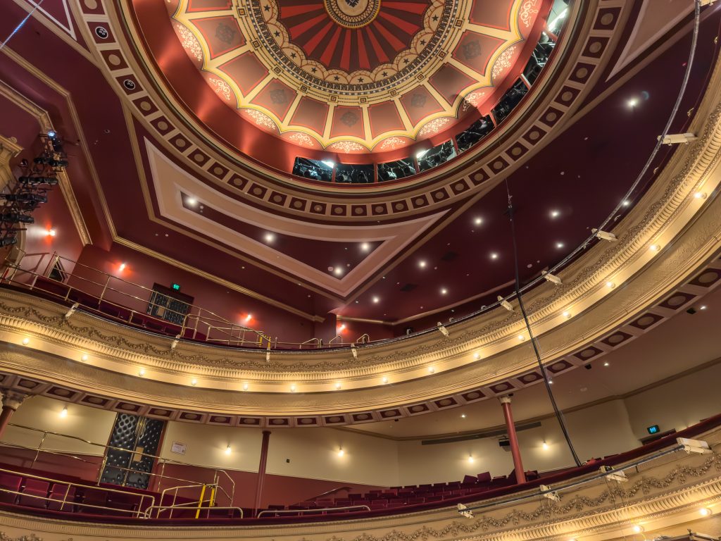The project encompassed a full auditorium house lighting replacement with new LED light sources, significantly improving energy efficiency and lighting levels whilst respecting the theatre’s historic character and heritage fittings.